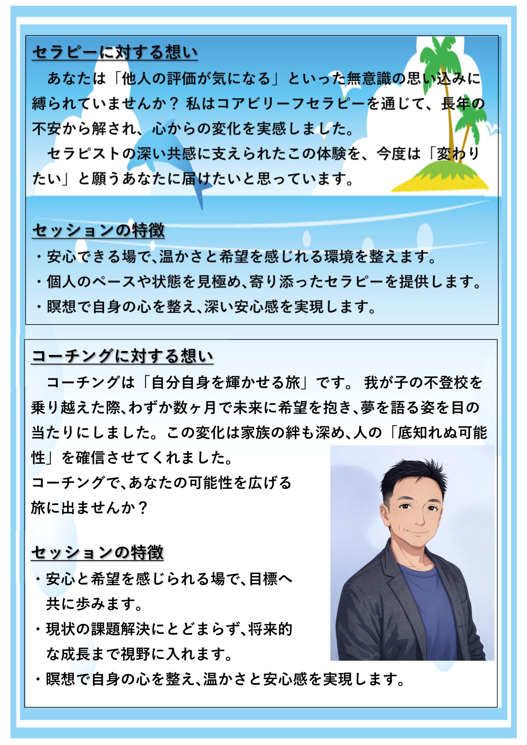 会社員、子どもを持つ親として7年前からセミナーや読書を通じ、親子関係を探求。2023年 クライエントの方に良いエネルギーを与えるため、自己の心を整えることの重要性を感じ、毎日30分以上の瞑想を習慣化。2024コーチングとコアビリーフセラピーの両講座を修了。これまでの学びと実践をいかし、逆境を乗り越えて未来へ進むサポートを行い、全ての人が笑顔で幸せに生きるための支援を人生の目標としている。